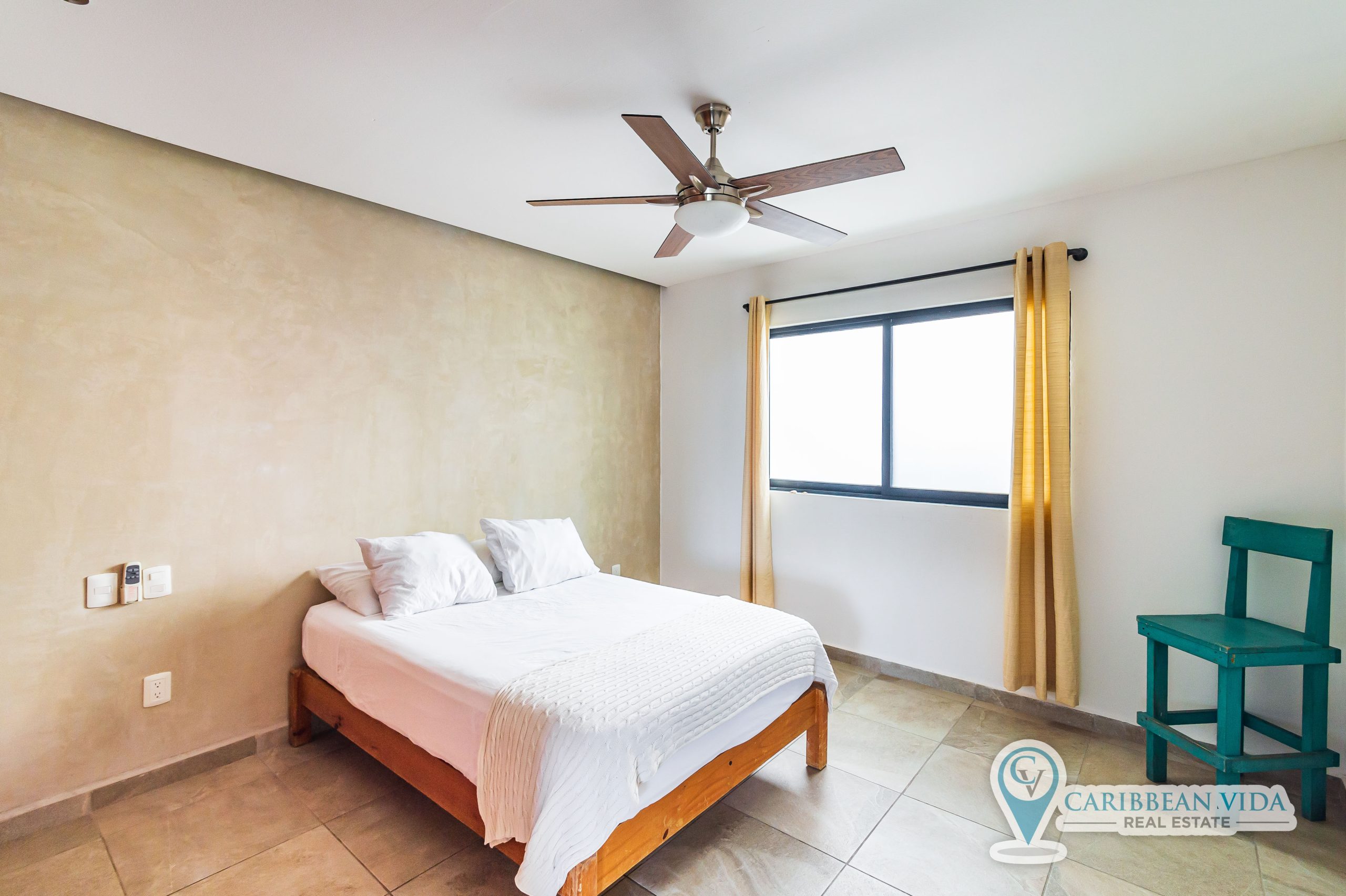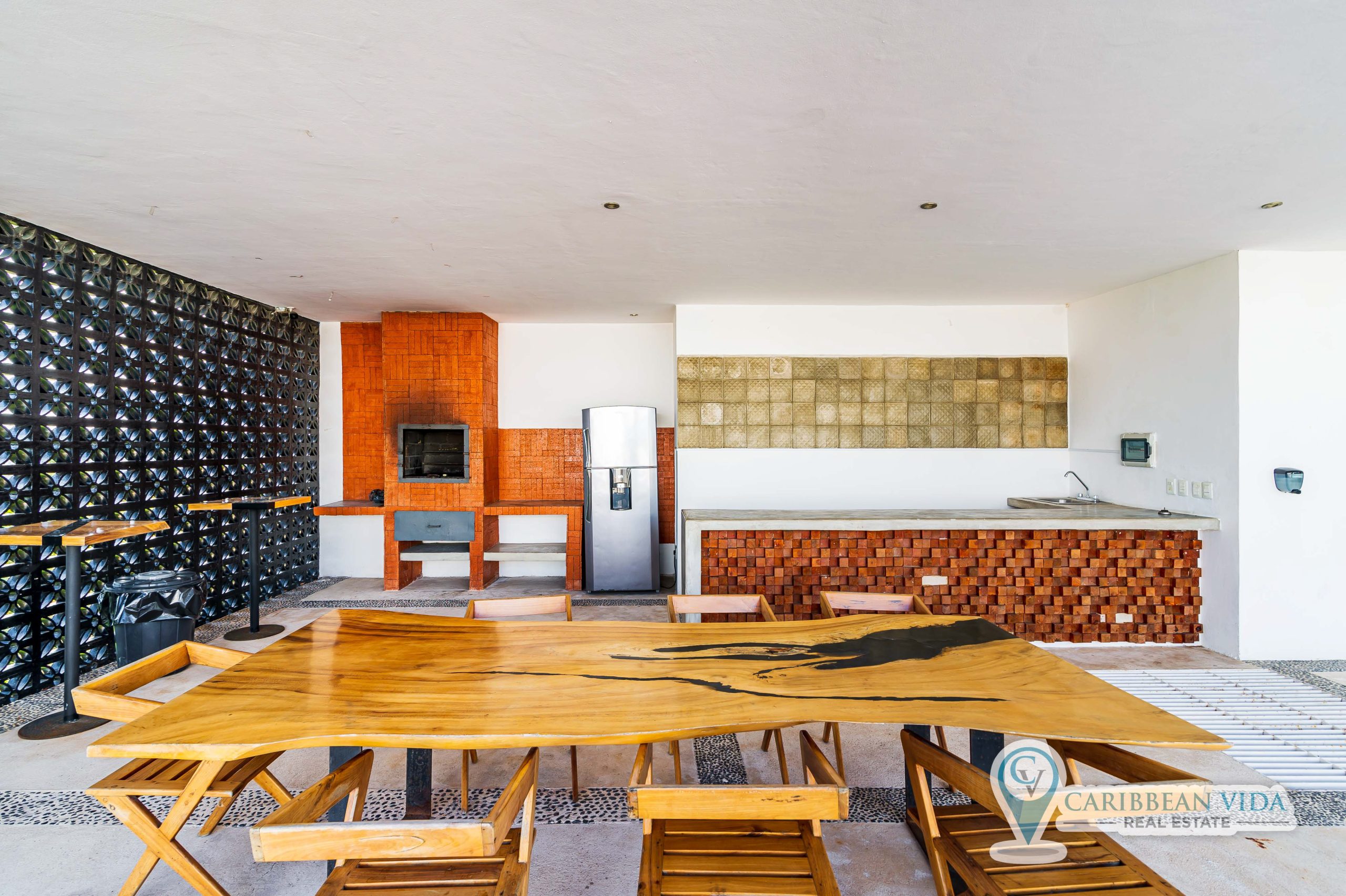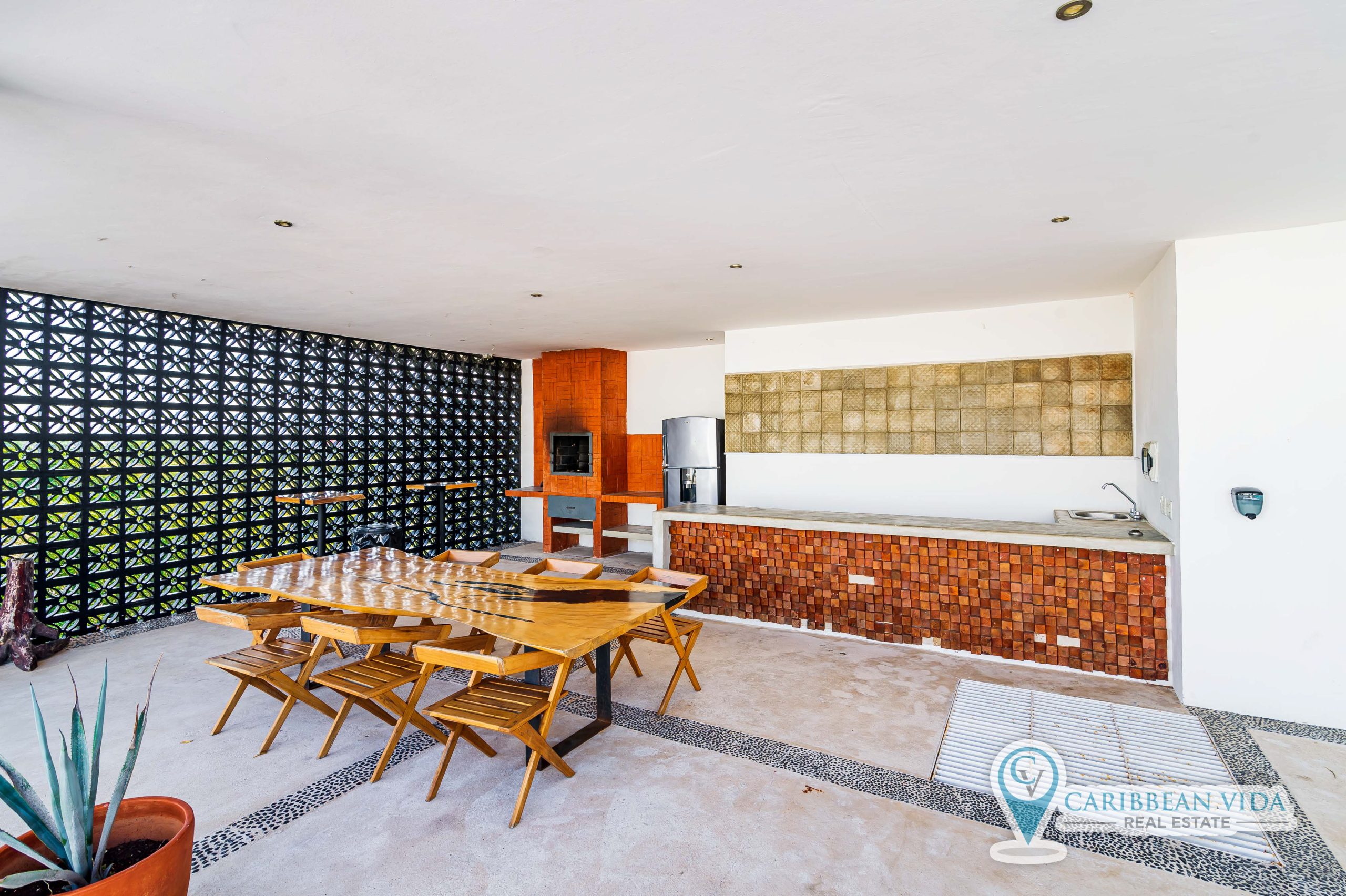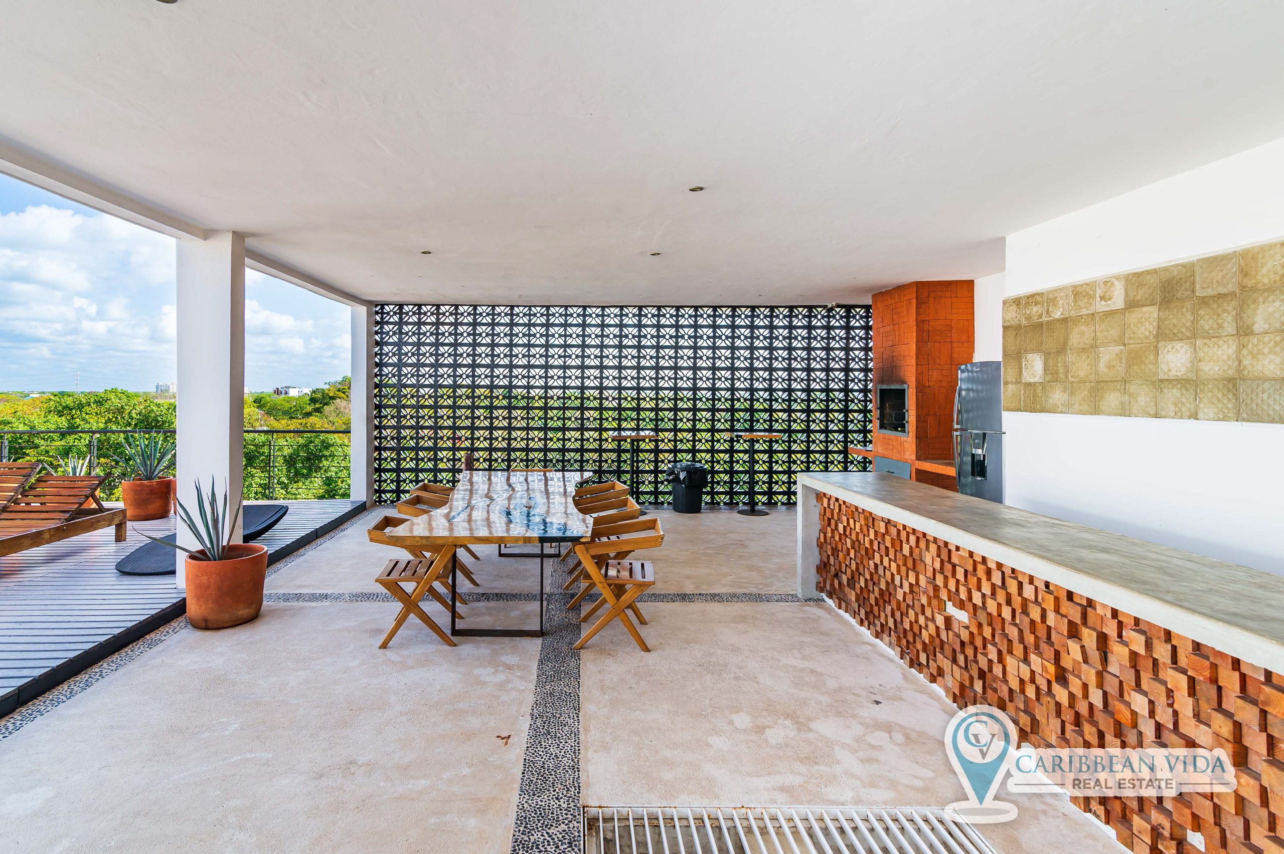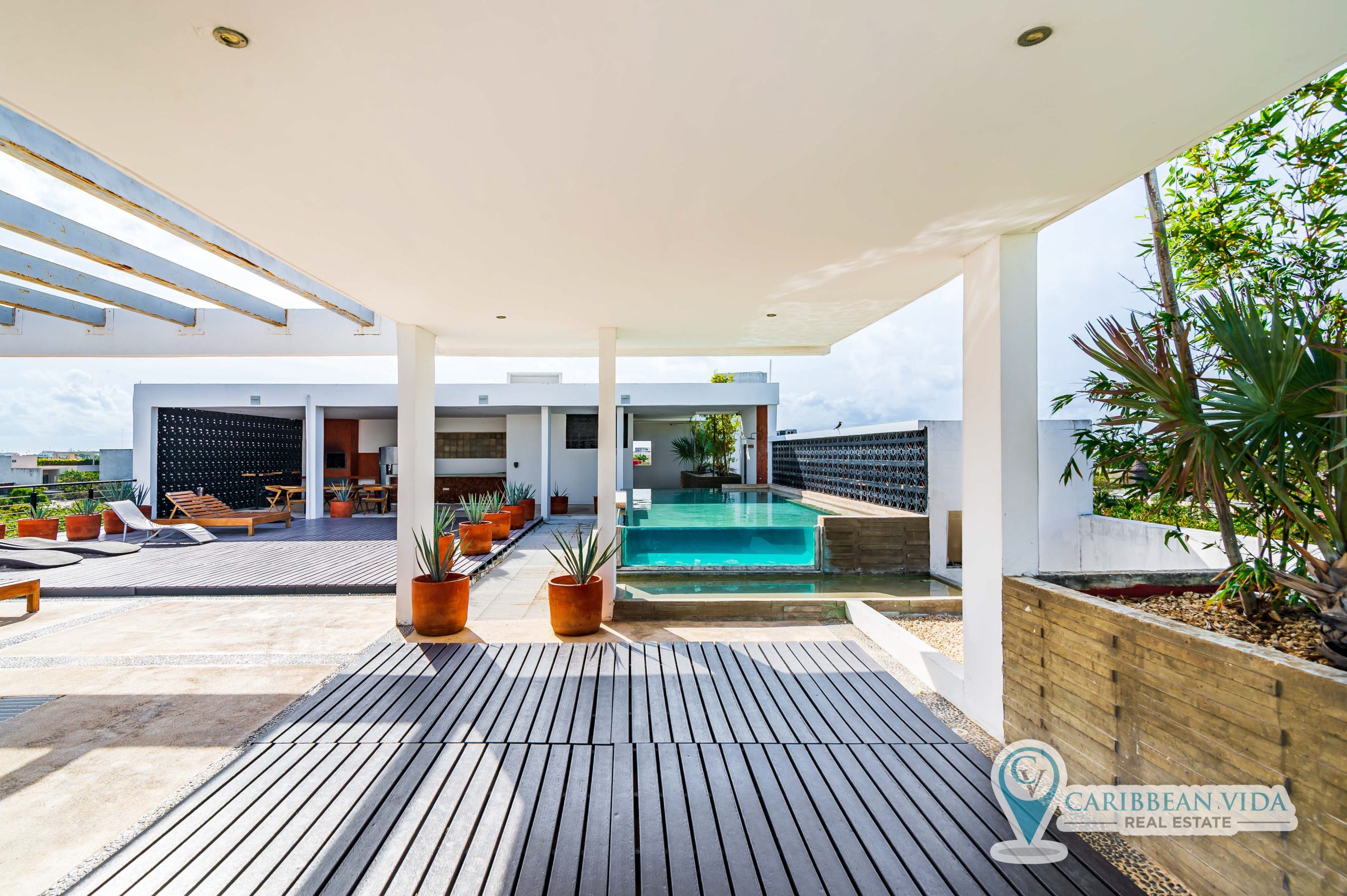 Beautiful bright top floor condominium with rooftop pool, covered dining area, bathrooms, and a subterranean jacuzzi type cenote inside a natural cave! This newer 2 BD | 2 BA condo also has a large private covered balcony.